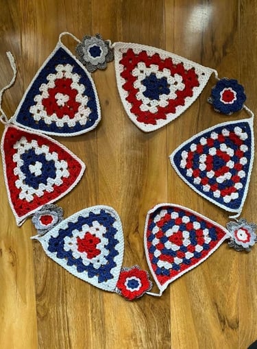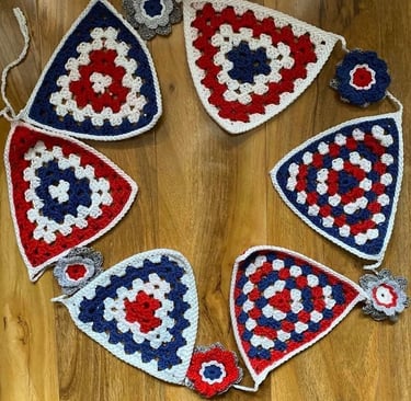 Create these gorgeous granny triangles with rosettes in the colour of your choice - great for a royal occasion or a special occasion closer to home.